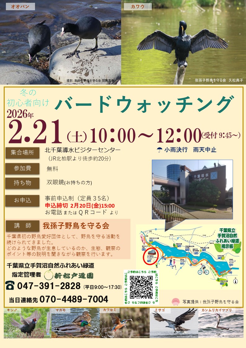冬の初心者向け バードウォッチング2026 2026 1/06 イベント 2026-01-06 開催日: 2026-02-21カテゴリー: イベント 昨年の様子はこちら 我孫子野鳥を守る会HP https://abikoyacho.org/topics/20250215.html ご予約はこちら https://forms.gle/3bHVGrHXeV63HyiY6 イベント URLをコピーしました! URLをコピーしました! 第39回TEGANUMAクリーンアップ大作戦 関連記事 第39回TEGANUMAクリーンアップ大作戦 2026-01-06 ミニ門松講習 2025-11-20 第37回TEGANUMAクリーンアップ大作戦 2025年11月15日(土) 2025-10-28 全国造園フェスティバル2025 2025-10-16 第36回クリーンアップ大作戦「WORLD CLEANUP DAY2025」 2025-09-04 第31回手賀沼エコマラソン 2025年10月26日(日) 2025-05-27 第18回 手賀沼トライアスロン 2025年6月22日(日) 2025-05-27 【満員御礼】植木屋さん体験 2025年6月21日(土) 2025-05-22